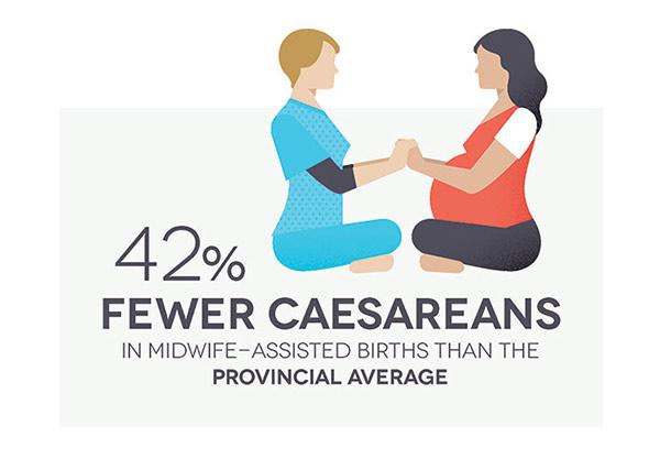 Midwives have a 42% lower caesarean section rate than the provincial average. However, in certain circumstances a caesarean birth may be recommended as a safer option than a vaginal birth. In most situations midwives are involved in the decision making process, and will usually be present during a caesarean birth and for healthy baby care afterwards.